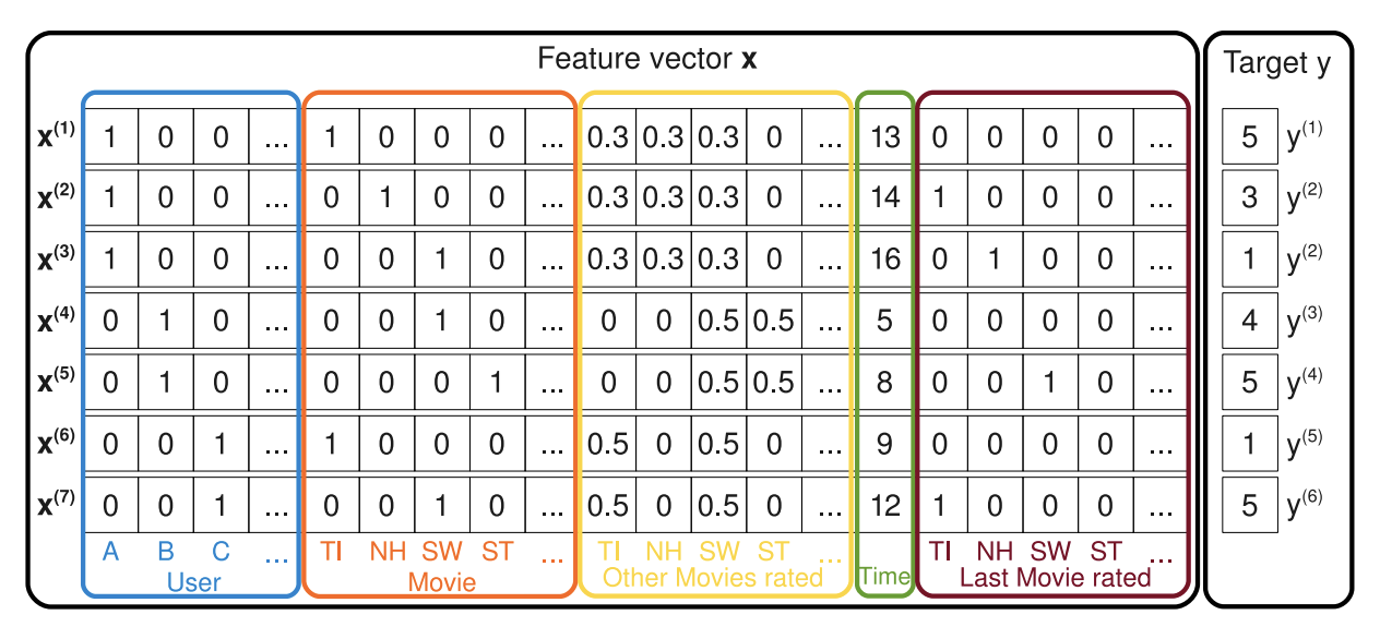 심지어 이전 구매 품목을 기반으로해서 사용자에게 product rank를 추천해주는 Factorized Personalized Markov Chain(FPMC) 또한 FM이 모방할 수 있음을 보인다.
