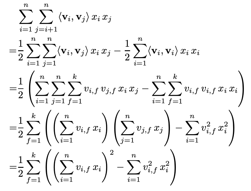 맨 아래 도출식을 보면 O(k * n)으로 구할 수 있다. (degree=2의 경우) sparse setting에서는 0이 대부분이므로 O(k * 0이 아닌 값들의 평균 갯수)로 더 줄어든다.