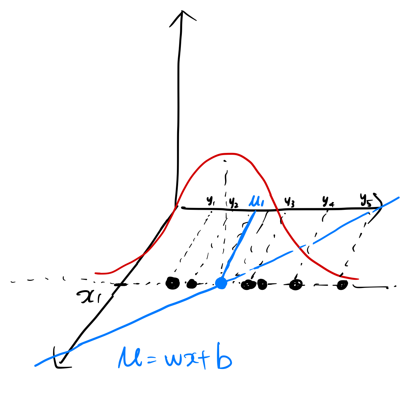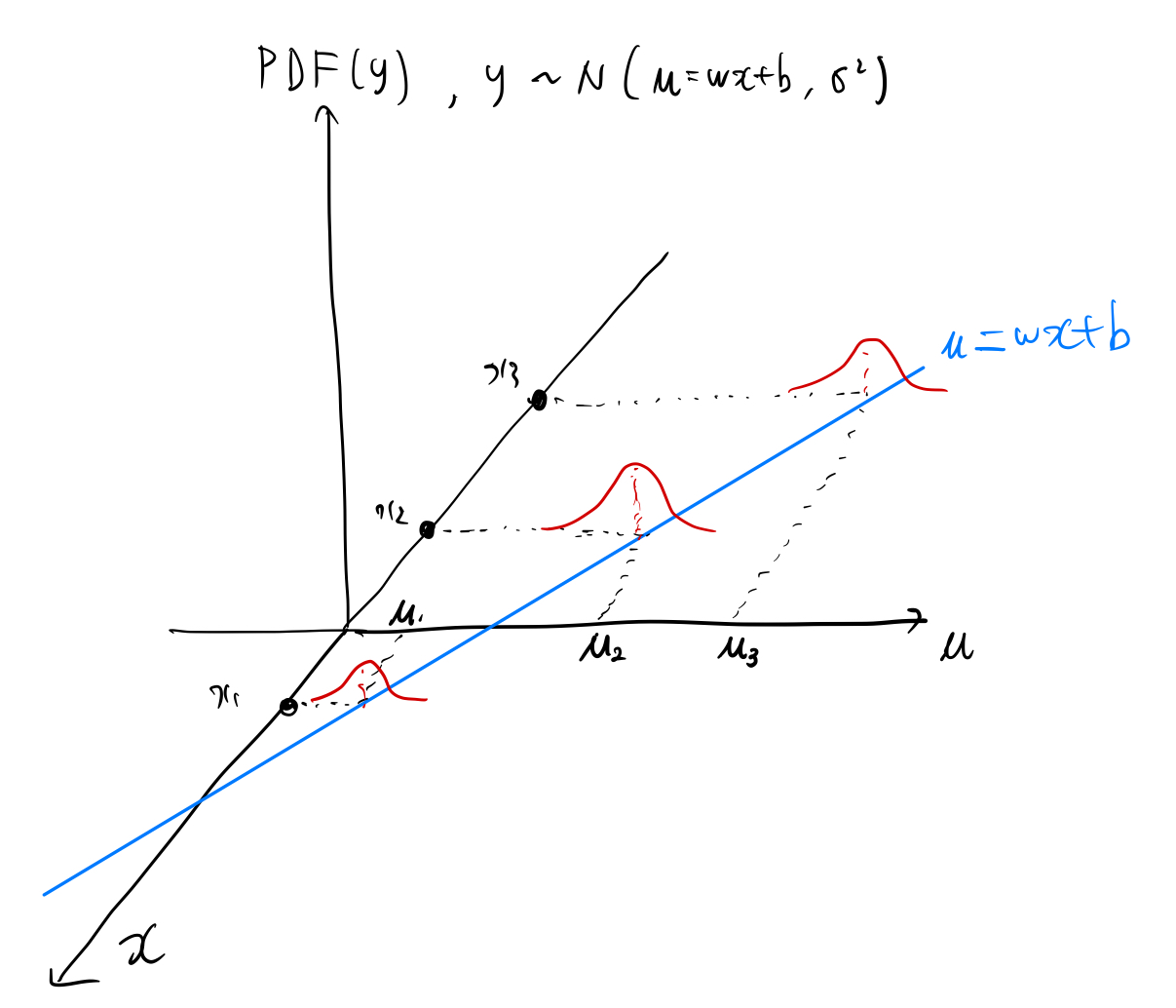 Let's assume the observed value y, given x, follows normal distribution with mean μ=wx+b and some variance σ².