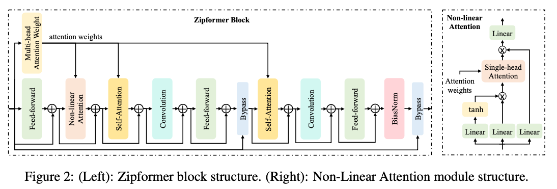 | conformer block | zipformer block, two conformer blocks and reuse attention weights |