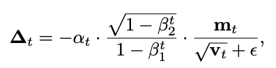 parameter update ∆t at step t in Adam, alpha t is learning rate.