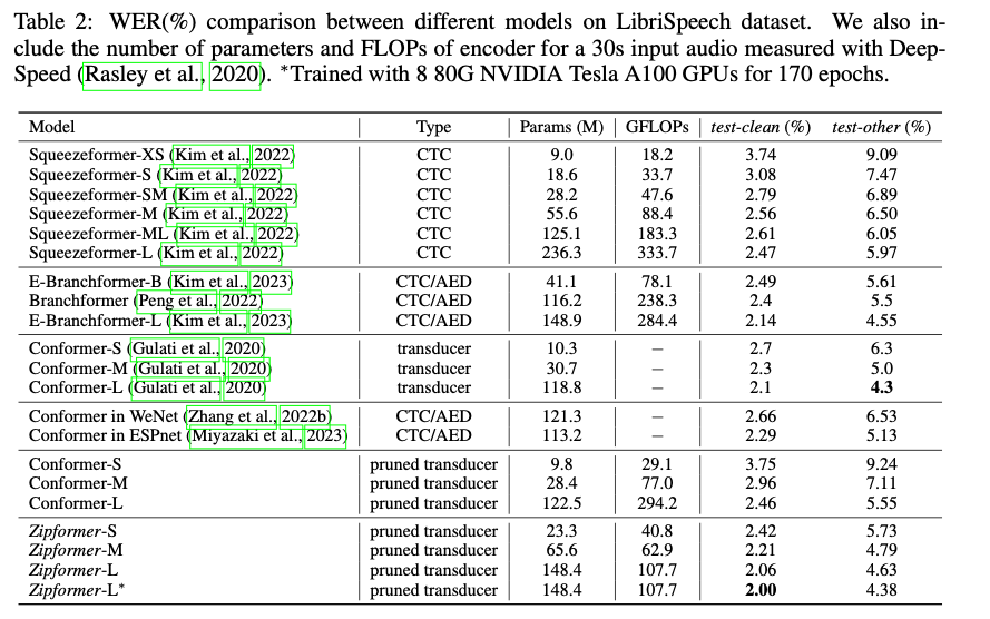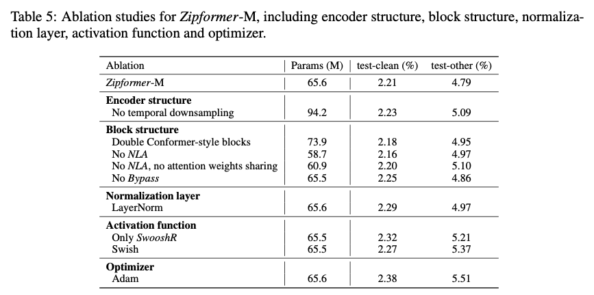 - As each Zipformer block has roughly twice modules as a Conformer block, we replace each Zipformer block in the base model with two Conformer blocks stacked together.