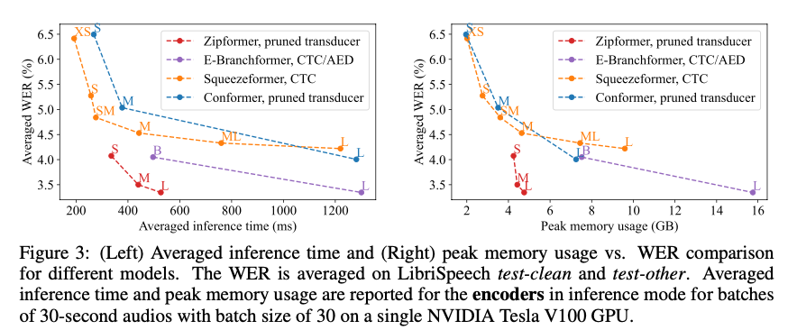 In overall, Zipformer models achieves better trade-off between performance and efficiency than other models.