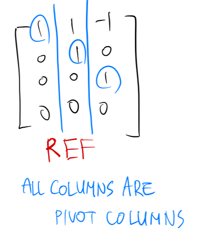 All column vectors are lineary independent if and only if all columns are pivot columns. If there is at least one non-pivot column, the columns are linearly dependent.
