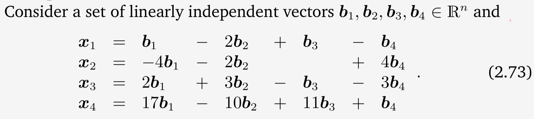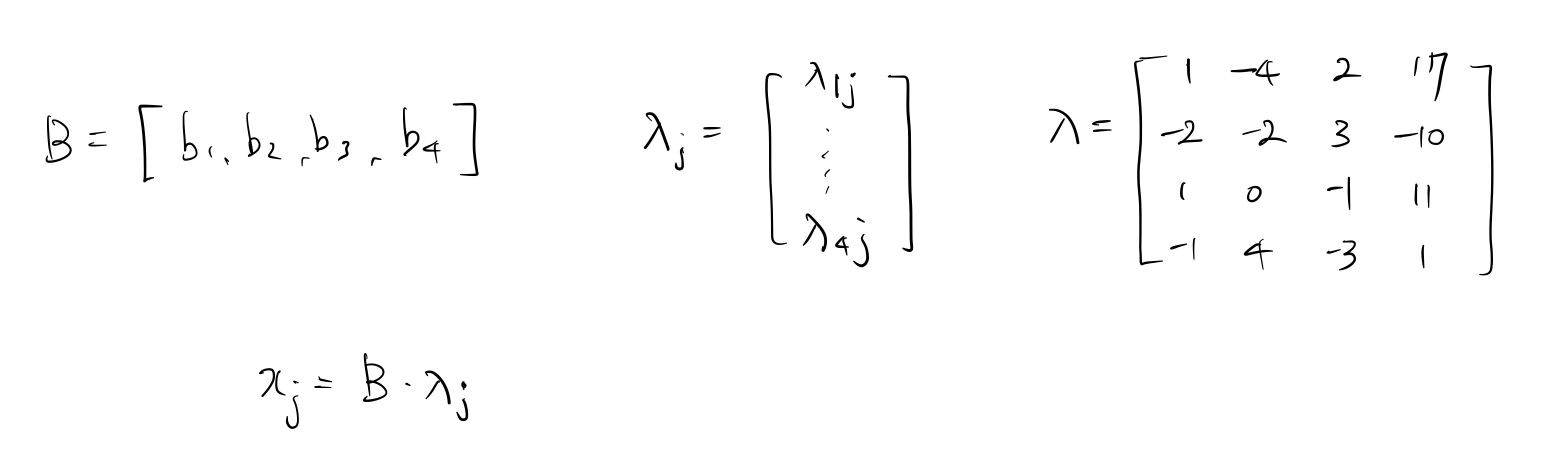 Let's define B = [b1, ..., b4] as the matrix whose columns are the linearly independent vectors. With B and λ we can express x like above.
