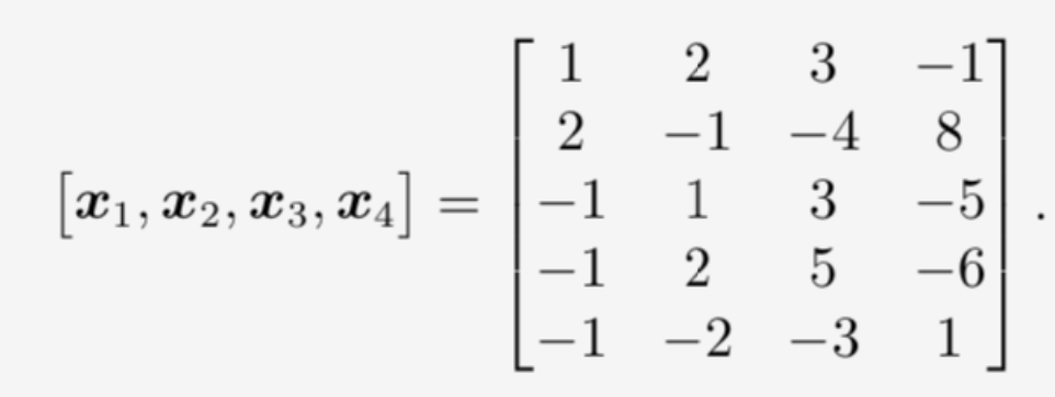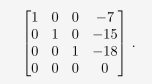 Then transform λ into RREF, there are only 3 pivot colmns(There are non-trivial solutions). This means that the vector x4 can be expressed with x1, x2, x3, x4 = -7x1-15x2-18x3. So the vectors {x1, x2, x3, x4} are linearly dependent.