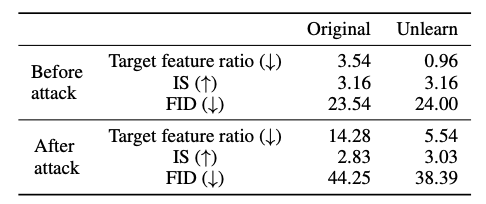 un-learned model generates less number of target images than the original model while maintaining high image quality in terms of IS and FID