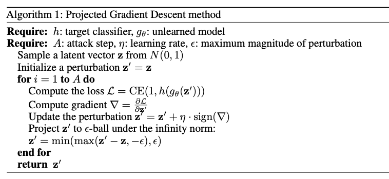 The purpose of this attack is to determine whether the unlearned model can be manipulated to produce images that contain the target feature, even after it has been supposedly removed.
