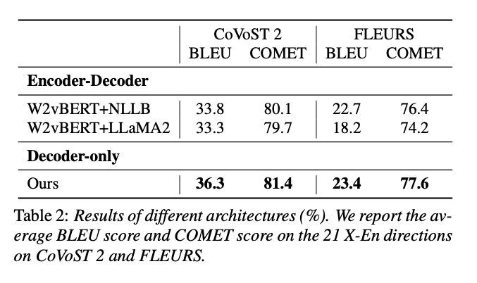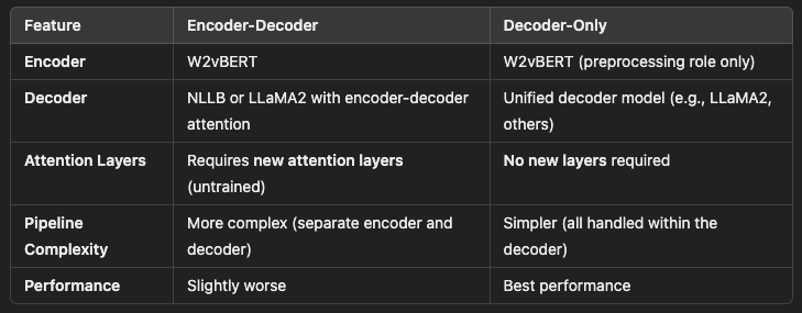 compare our decoder-only architecture with encoder-decoder models, with NLLB and LLaMA-2 as the text decoder.