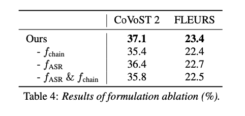 Notably, training with f and f_ASR slightly underperforms f , showing that multi-task training with ASR does not always improve performance.