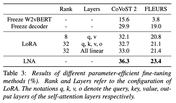 freeze W2vBERT and fine-tune / freeze decoder and fine-tune / LoRA fine-tune / LNA fine-tune