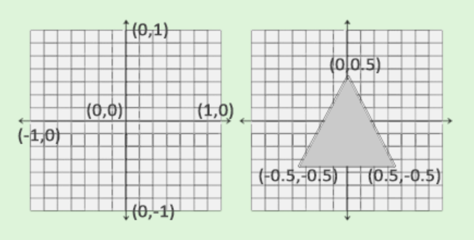 - 각 좌표는 x, y, z축에 대해서 -1.0 과 1.0 사이의 값이다. 이 범위의 좌표를 normalized device coordinates라고 한다. 이 범위를 visible region of OpenGL이라고 한다.