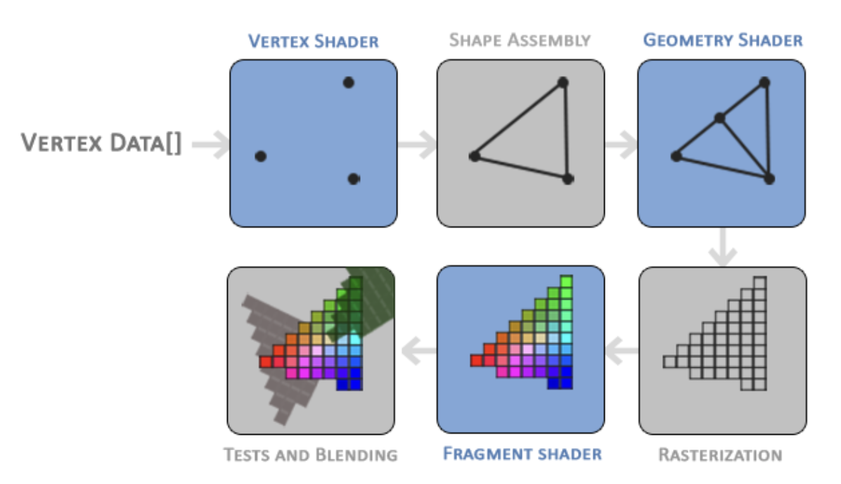 - 아래 그림이 pipeline의 단계들에 대한 추상적 표현이다. blue section이 개발자가 직접 configure한 shader를 넣을 수 있는 영역이다.