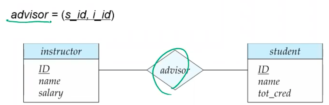 - 일반적으로 entity set, relation이 하나의 table이 된다. 그 안의 속성들이 column으로 변환된다.
