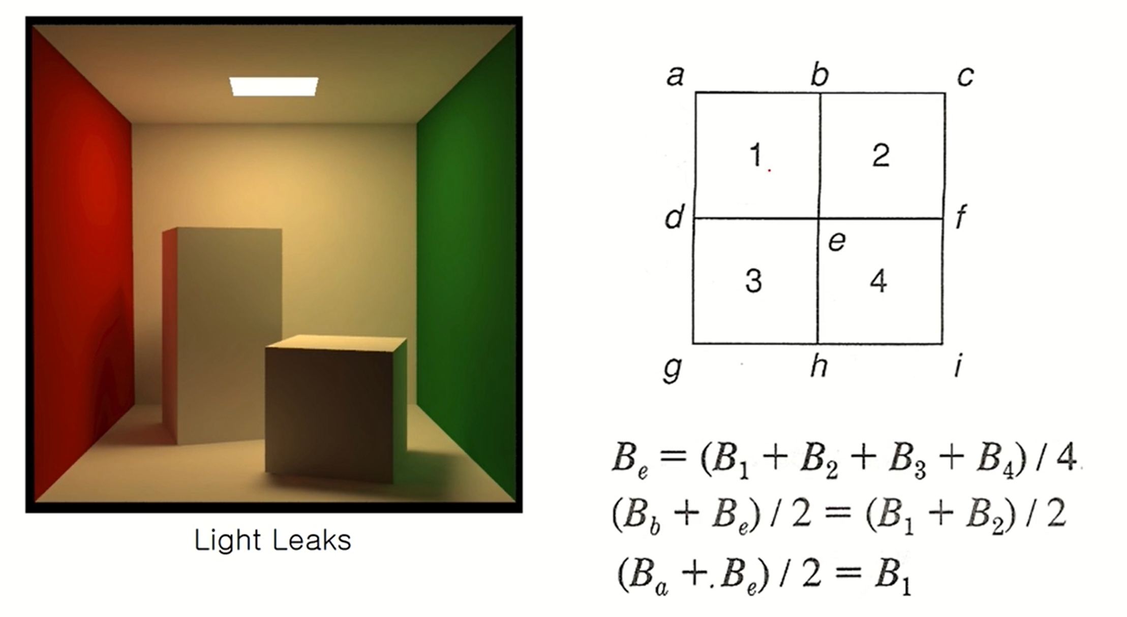 - 처음에는 광원으로부터 모든 패치로 light enery가 도달하겠지만 두번째부터는 새롭게 E들이 갱신되어 모든 patch로부터 빛이 뻗어나갈 것이다(한번 반사된 빛들). 그렇게 두번째 B가 계산된다. 다시 또 E를 업데이트 하고 새로운 B를 구하면 두번째 반사된 빛들을 계산할 수 있다.