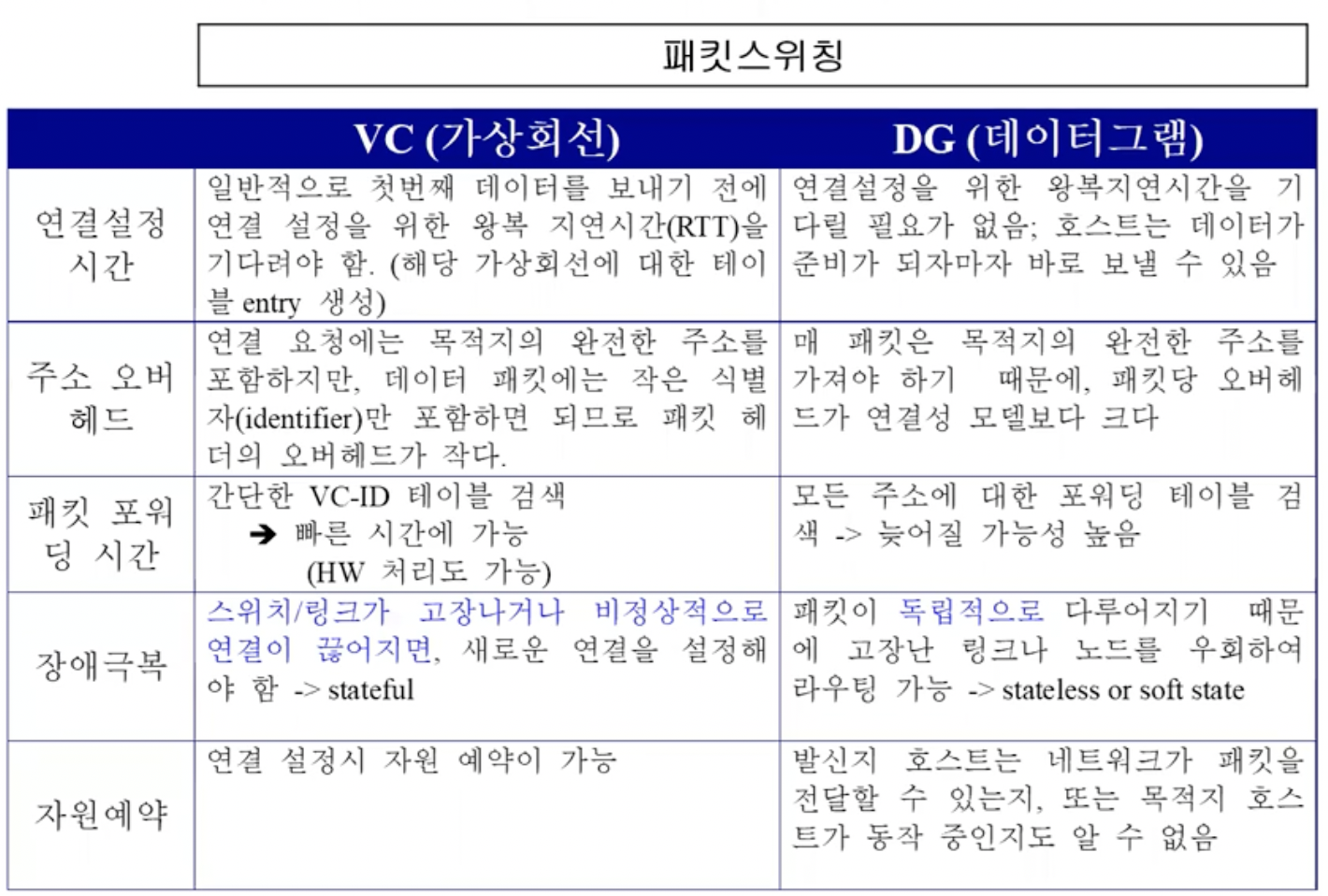 - 데이터그램은 테이블이 길어진다면 탐색에 시간이 걸릴 수 있지만 가상회선은 테이블에 access만으로 빠른 검색이 가능하다.