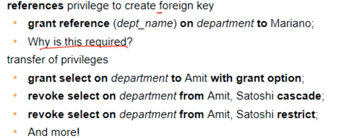 - 첫번째 예시 : Amit에게 department를 조회할 수 있는 권한을 준다. with grant option은 amit이 이 권한을 다른 사용자에게 줄 수 있다는 옵션을 말한다.